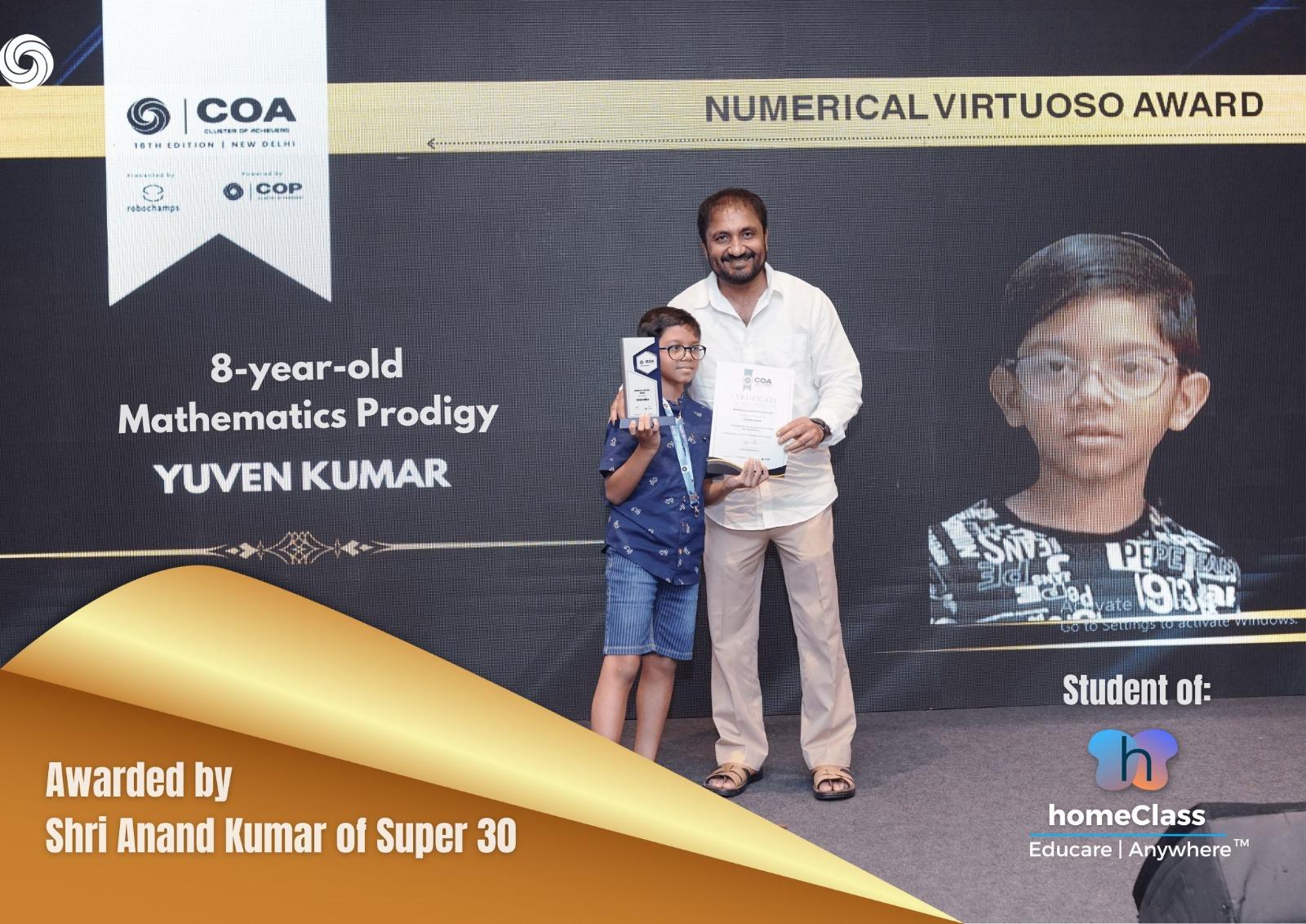 The recognition of Yuven’s talents reached a pinnacle at the Cluster of Prodigy award ceremony held in New Delhi on May 11, 2024. There, he was honored with the prestigious “Numerical Virtuoso Award” by Shri Anand Kumar, the esteemed Founder of Super 30. This accolade celebrates Yuven’s outstanding achievements and his remarkable journey from Nursery to Class 7 in just six years.